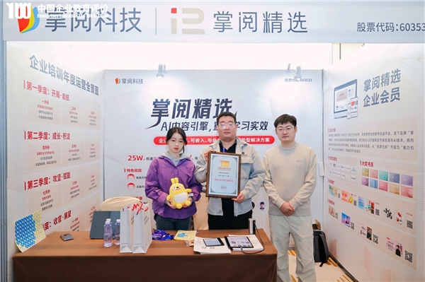 掌阅科技作为企业智慧阅读领域的代表受邀参会,凭借掌阅精选提供的“内容+AI+运营”一体化学习方案,荣获“中国企业培训首选服务商”称号,并在现场与数百位央国企培训管理者展开深度交流,收获广泛关注。